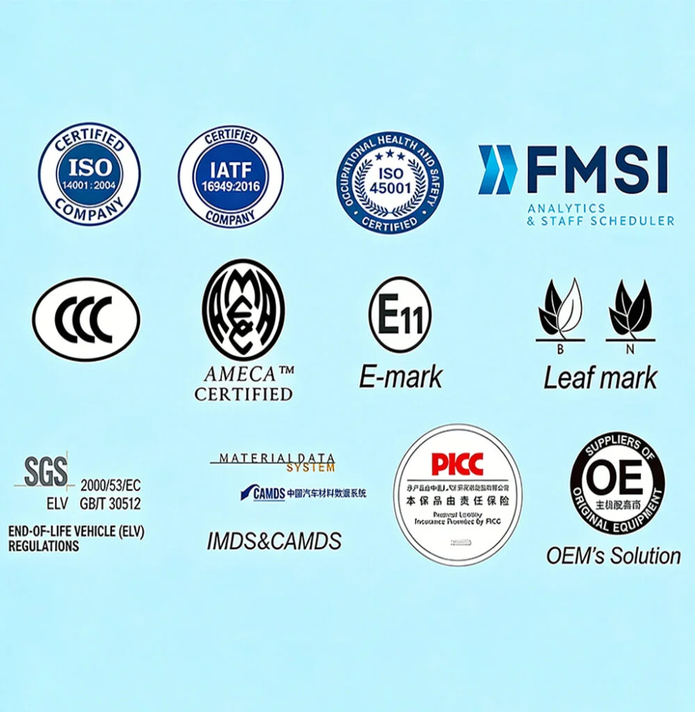 Certified to IATF 16949, ISO standards, E-mark, AMECA, FMVSS 135, and CCC. Compliant with GB 5763-2018 and global market requirements. Supported by 50+ patents.