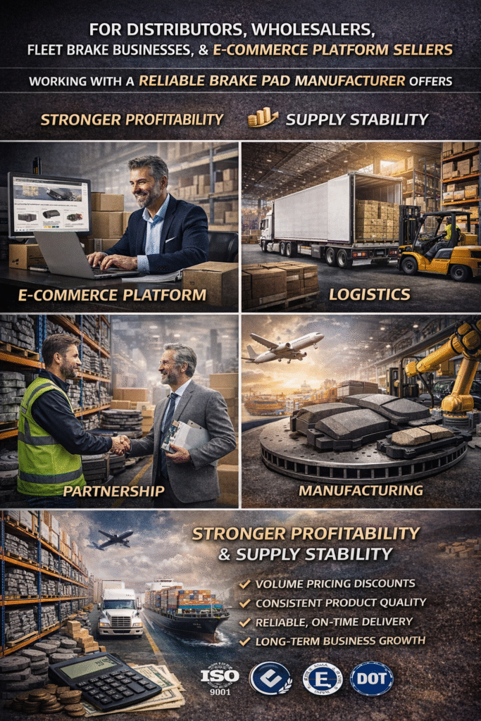 For distributors, wholesalers, Fleet Brake businesses, and E-Commerce Platform sellers, working with a reliable brake pad manufacturer offers stronger profitability and supply stability.