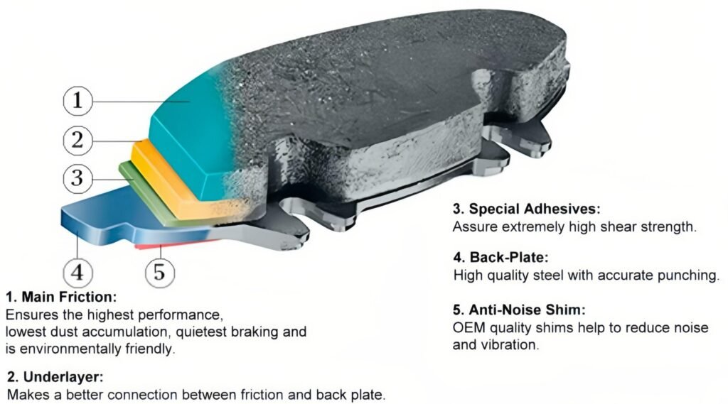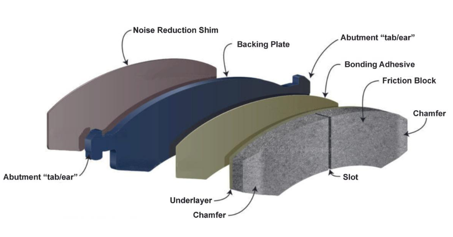 Brake pads contain four primary component types: binders, fillers, reinforcements, and friction modifiers. Fillers like barium sulfate and synthetic graphite manage cost and volume. Friction modifiers — such as silicon carbide and zinc — fine-tune the coefficient of friction. The adhesive quality impact cannot be overstated. Weak bonding between the friction layer and the backing plate is a direct path to pad delamination under stress.